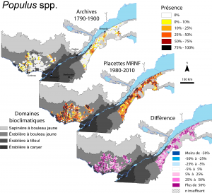 Par exemple, la figure 4 montre comment les pins, qui étaient surtout présents dans l’ouest du Québec, ont fortement diminué depuis l’époque préindustrielle. Cela s’explique par l’exploitation intensive de cette essence. Inversement, la forte augmentation des peupliers illustrée à la figure 5, s’explique par l’augmentation de la fréquence des feux lors de la phase de colonisation des terres durant les XIXe et XXe siècles.