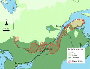 Le laboratoire d’écologie historique de l’Université du Québec à Rimouski, dirigé par le professeur Dominique Arseneault, étudie la dynamique à long terme des forêts tempérées du Québec méridional. L’objectif général de ce travail est de comprendre l’impact à long terme des activités humaines sur les paysages forestiers. Notre région d’étude correspond à la forêt tempérée du Québec méridional, de l’Abitibi à la Gaspésie (figure 1), là où la colonisation et l’exploitation forestière ont influencé la forêt depuis deux siècles.