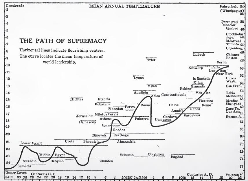 – Andrew might have pointed you to this one already, but Stefansson’s graph of the northward course of empire (playing on Ellsworth Huntington’s arguments about climate and civilization) is a good way to start a discussion about early 20thc. northern boosterism in Canada and the US, climatic determinism, and so on (http://1.bp.blogspot.com/-oRCtVUCf8qw/UDis84YwsMI/AAAAAAAACJ8/pmjwoehw8yg/s1600/empirenorth.JPG)